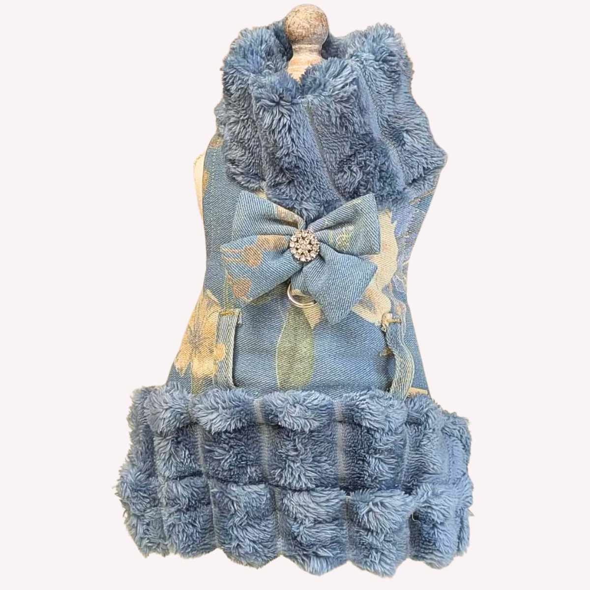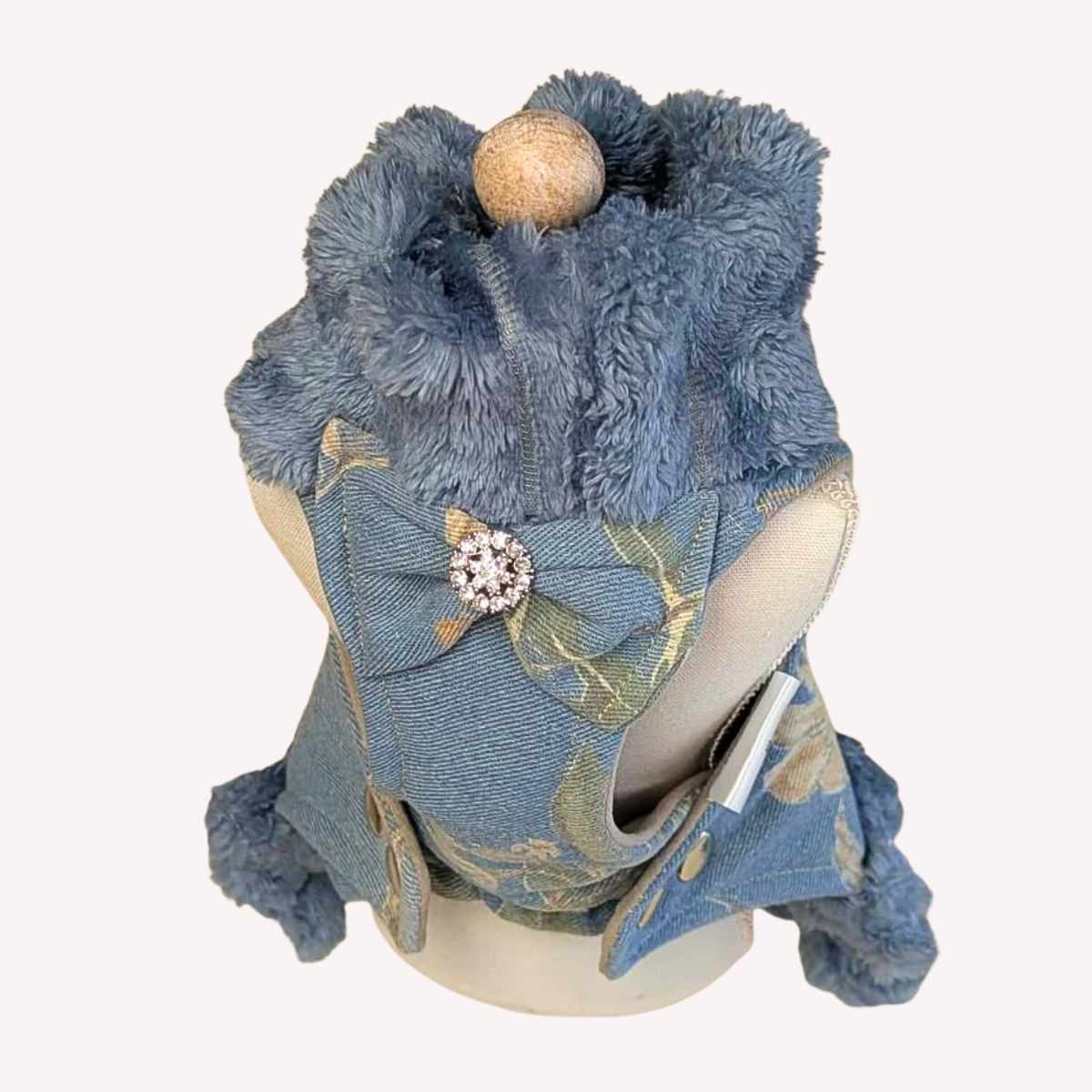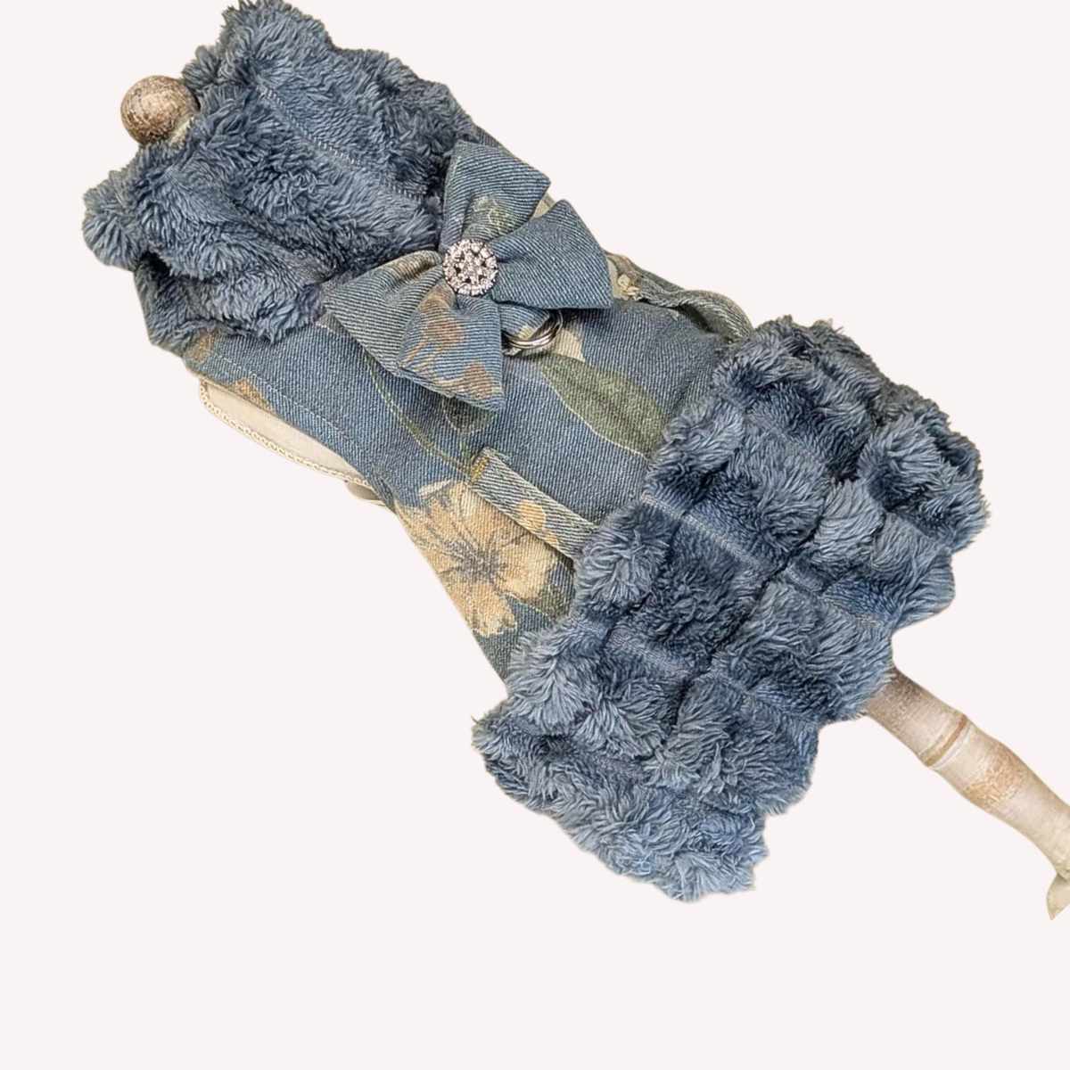 Una creazione unica che combina il denim blu con una soffice pelliccia sintetica blu, completata da un raffinato fiocco con strass centrale e finiture in argento.