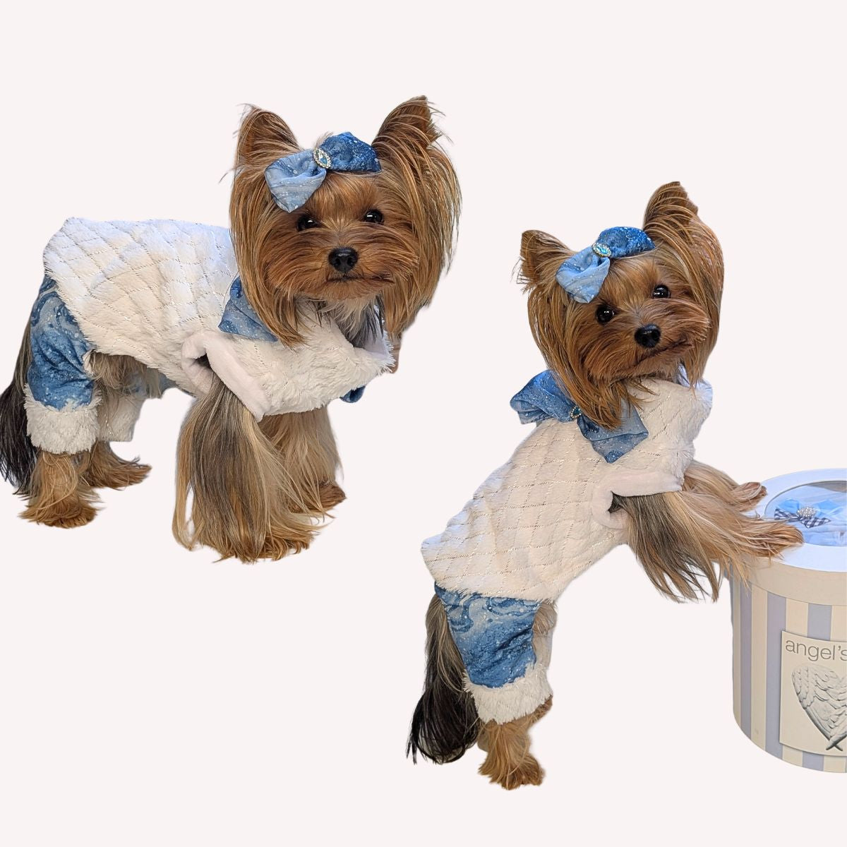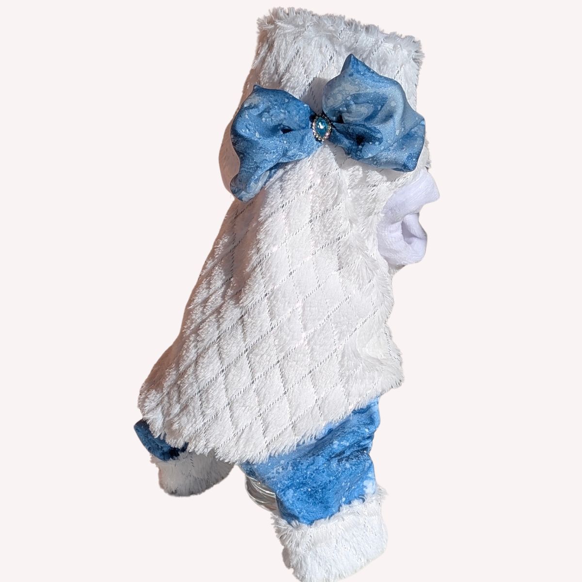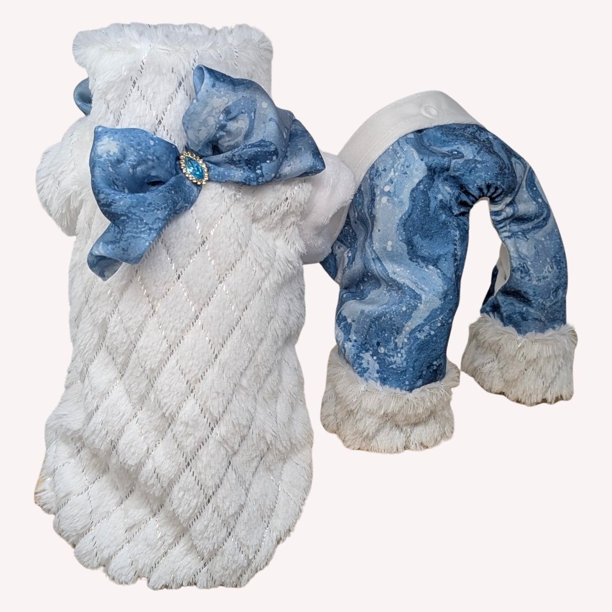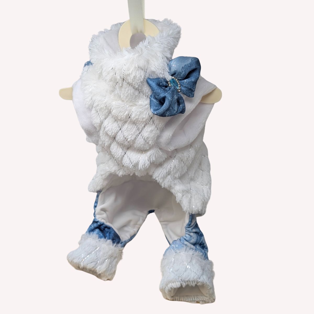 Questa tutina esclusiva è realizzata in eco-pelliccia certificata color bianco, morbida ed elastica, foderata con velluto certificato per garantire il massimo comfort. I raffinati fiocchi in satin leggero blu con strass e i pantaloni in velluto Blu foderato aggiungono un tocco di eleganza chic.