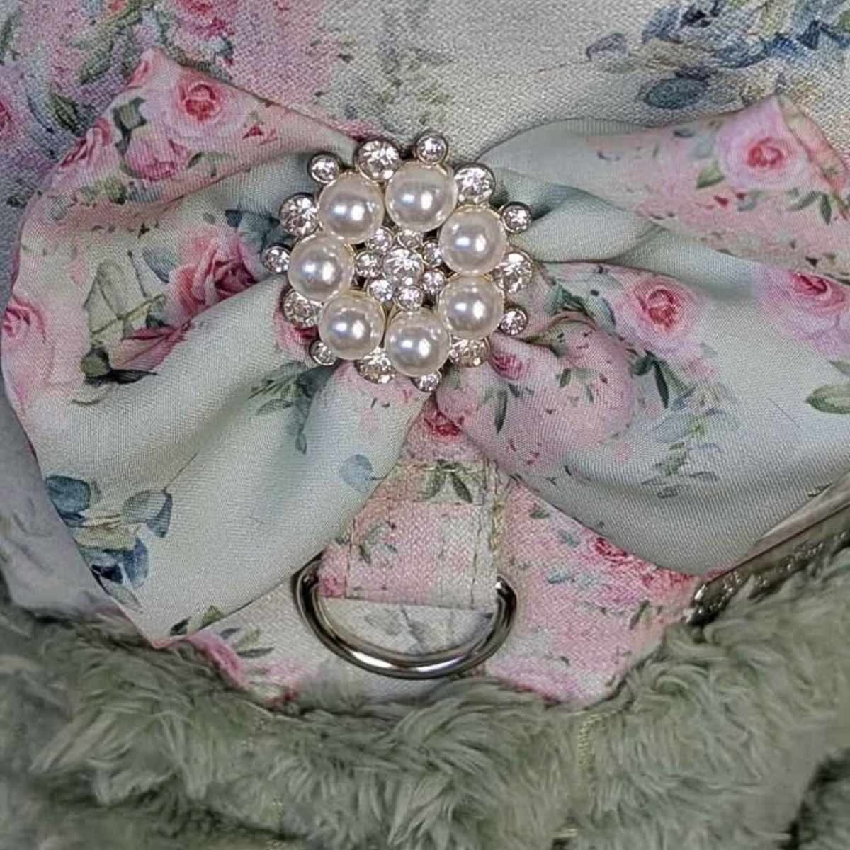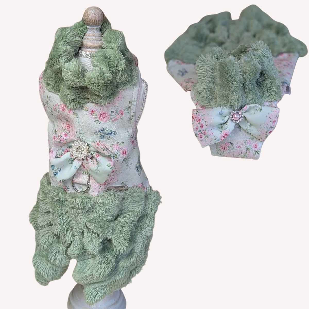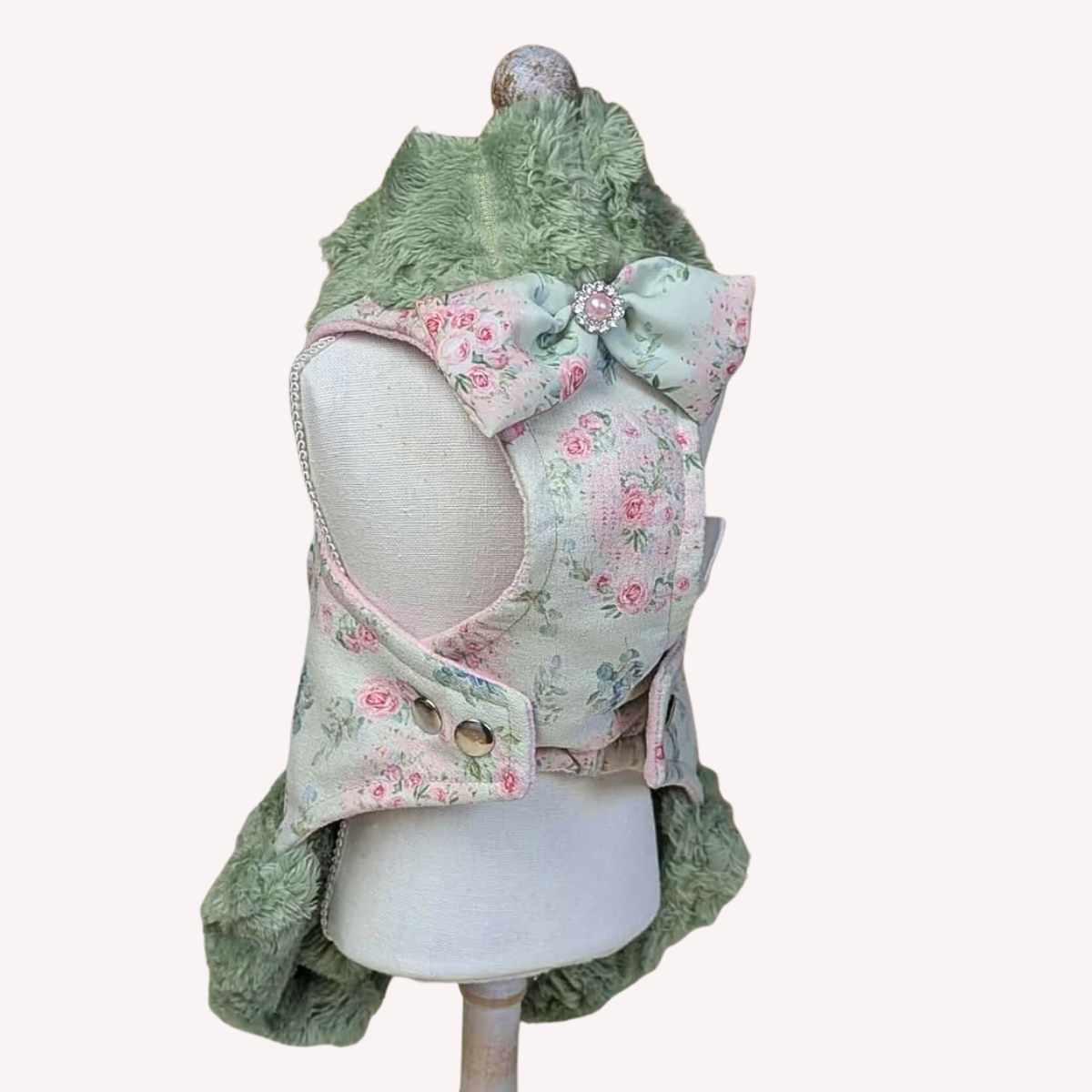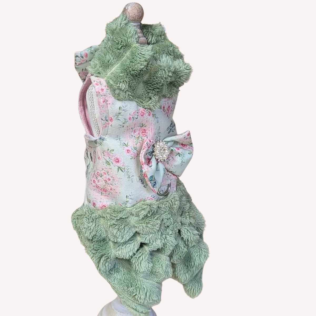 Un capolavoro che unisce il delicato tessuto floreale verde acqua con rose rosa alla soffice pelliccia verde smeraldo, impreziosito da un raffinato fiocco con perle e strass.