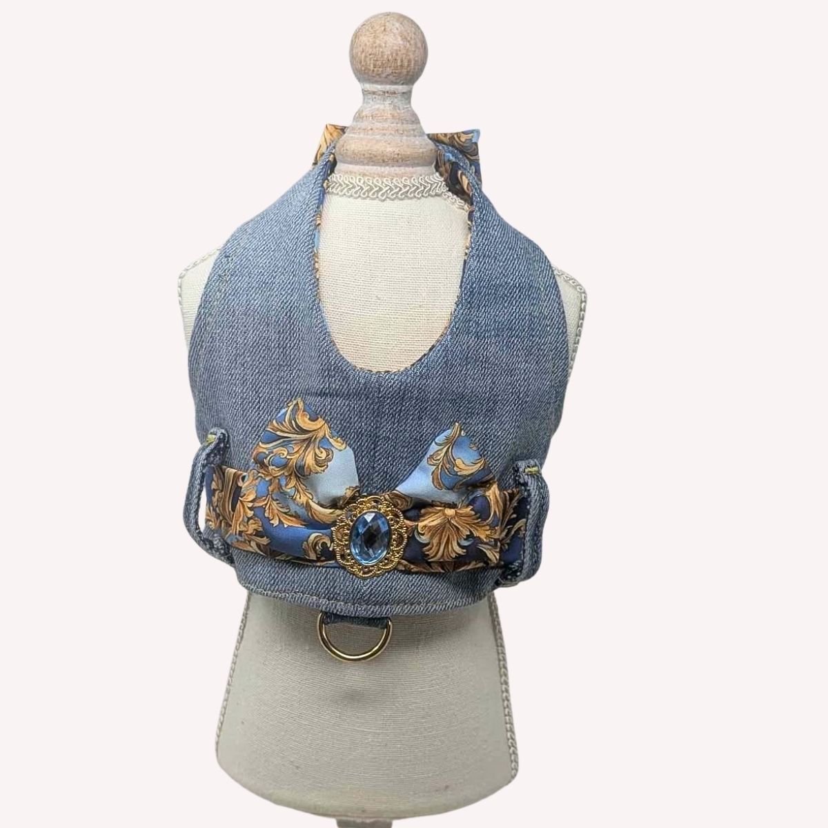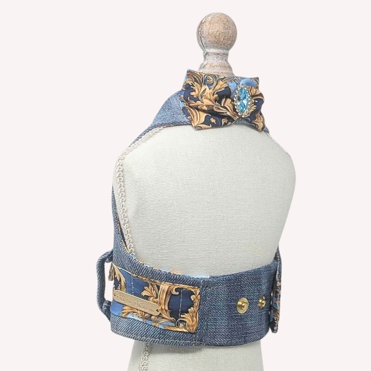 Pettorina esclusiva che unisce la robustezza del jeans alla magnificenza dei motivi barocchi blu, realizzata a mano con strass preziosi che esaltano ogni dettaglio decorativo.