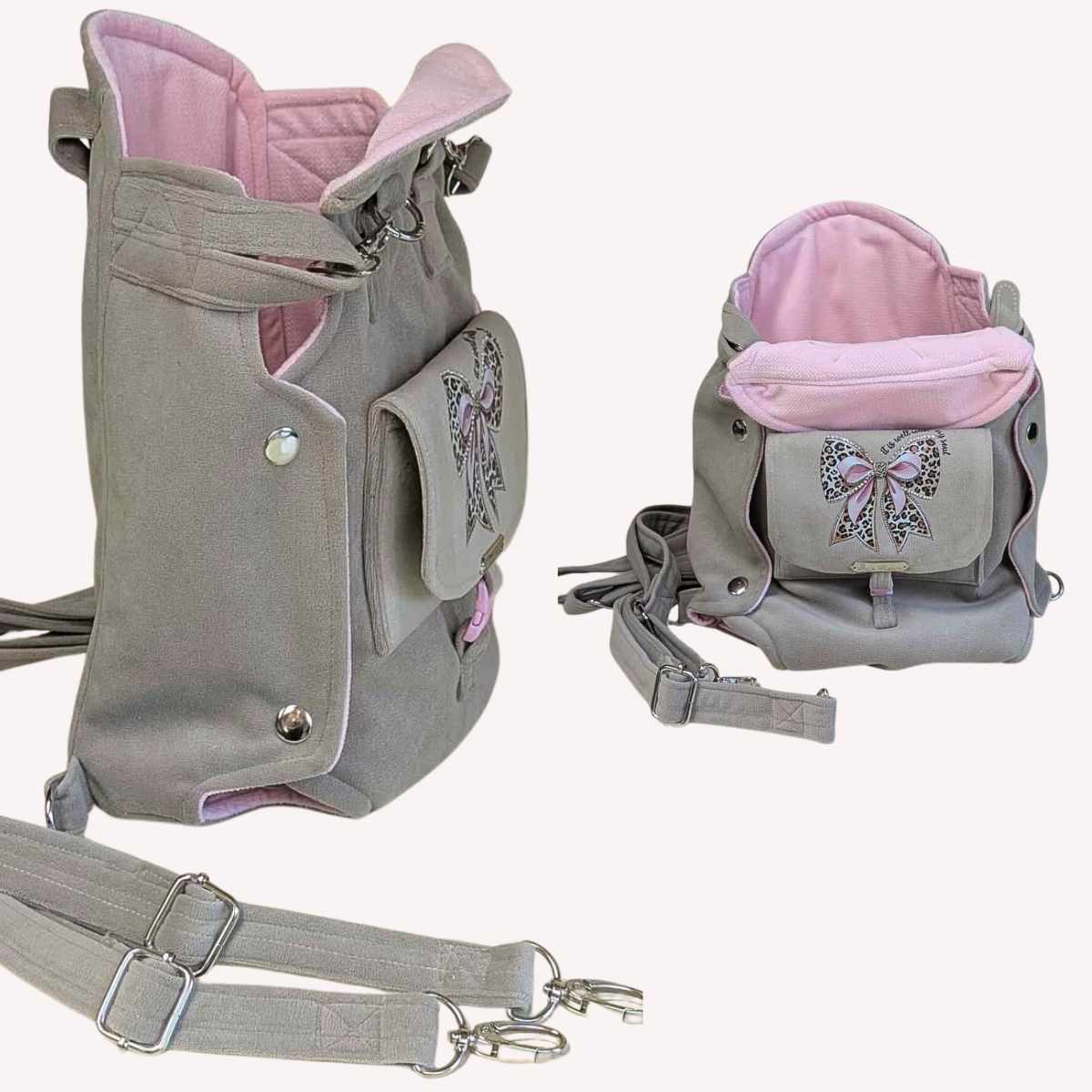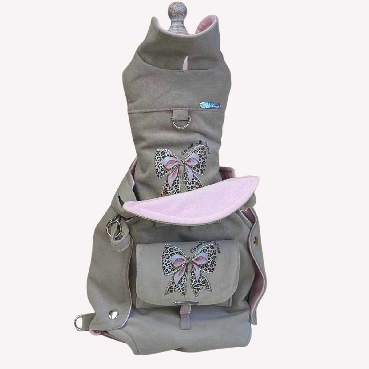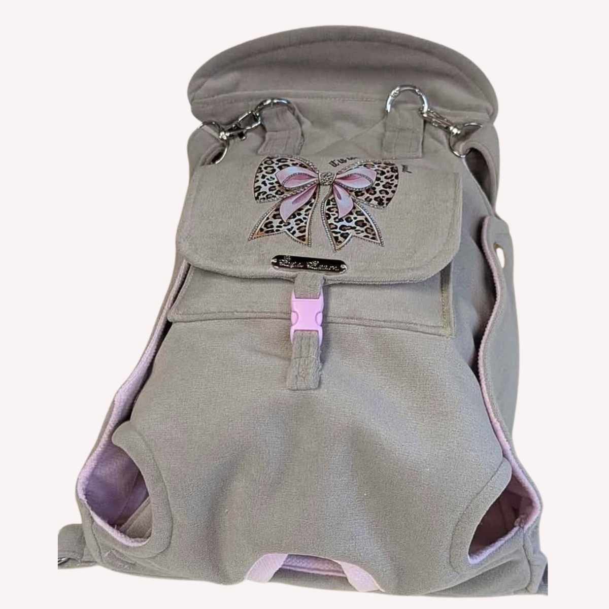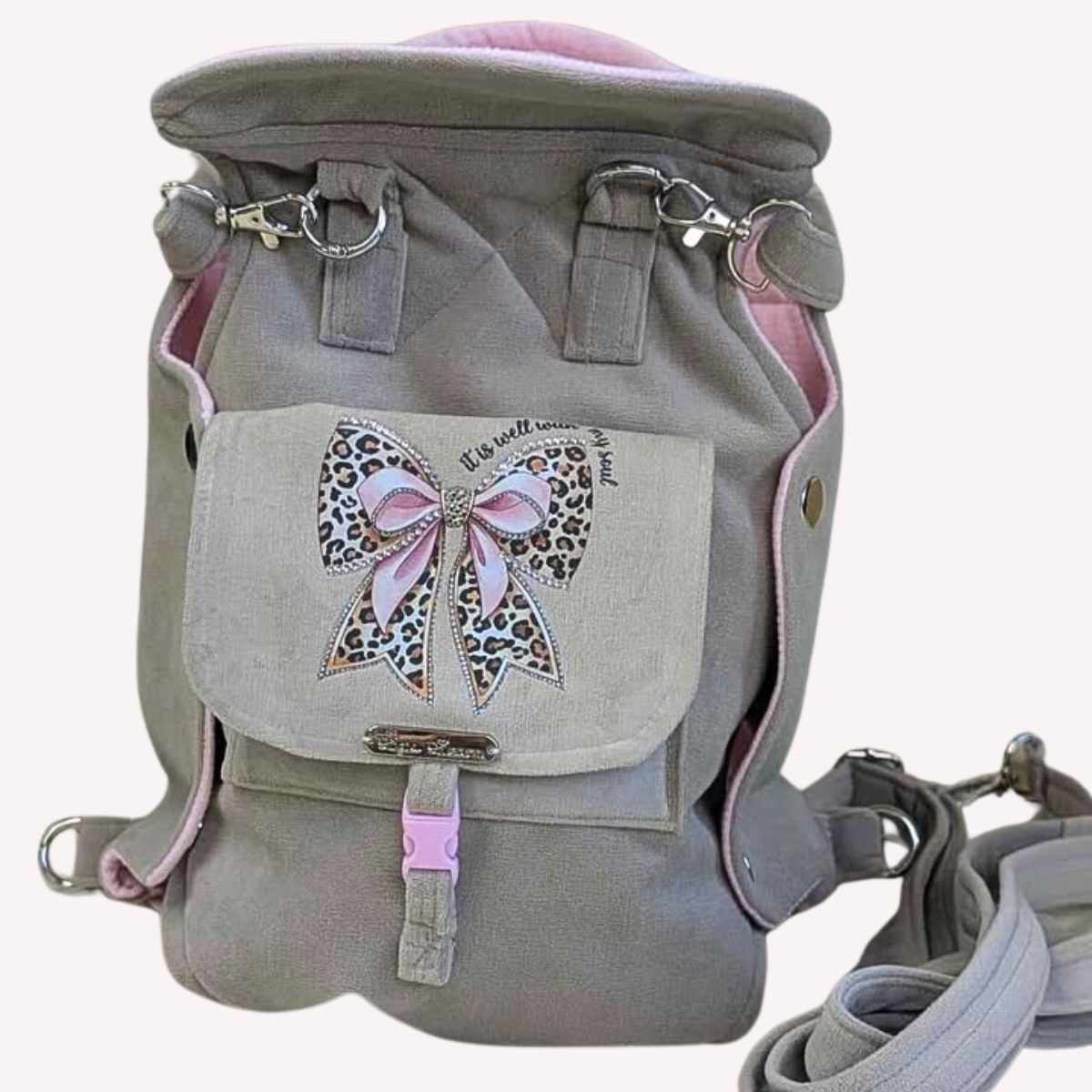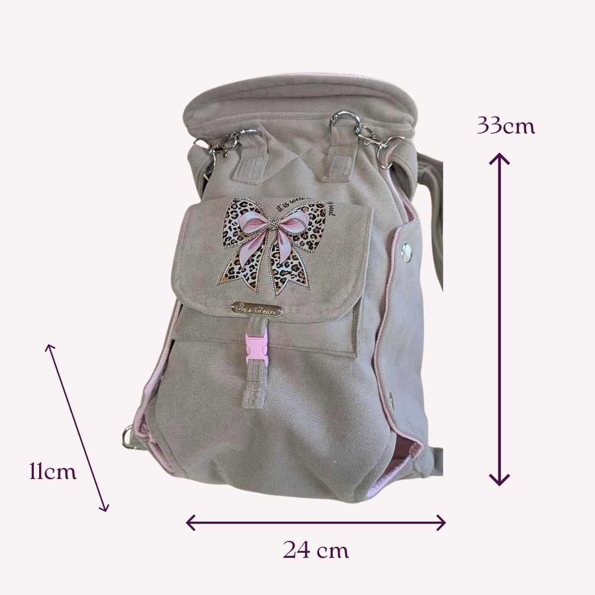 Realizzato completamente a mano con tessuto beige di alta qualità e delicata fodera rosa, impreziosito da un raffinato fiocco leopardato con strass applicati a mano.